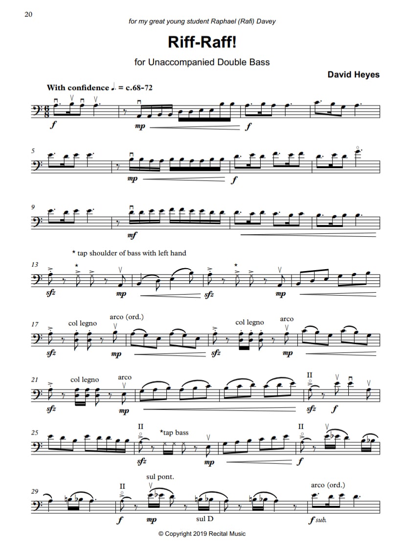 ‘Riff-Raff!’ was composed for Raphael Davey, one of my young students, and uses a limited number of notes and positions in the lower register of the instrument. Known to his family and friends as Rafi, the piece is fun, lively and rhythmic, with a constant energy which totally reflects the spirit and personality of Rafi. Repetitions are used to create cohesion and unity alongside col legno, sul ponticello, percussion and harmonics which add interest and variety.