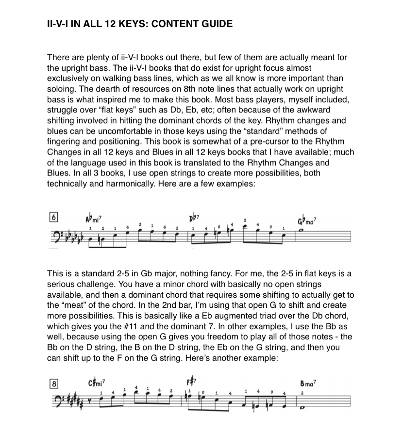 There are plenty of ii-V-I books out there, but few of them are actually meant for the upright bass. The ii-V-I books that do exist for upright focus almost exclusively on walking bass lines, which as we all know is more important than soloing. The dearth of resources on 8th note lines that actually work on upright bass is what inspired me to make this book.
